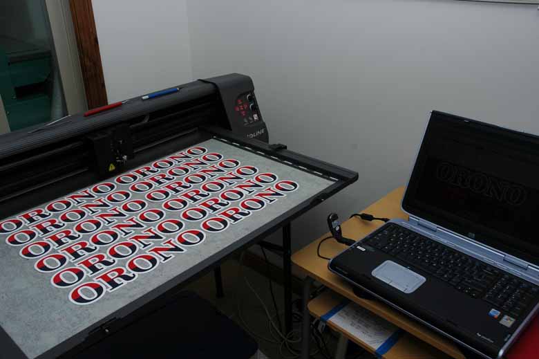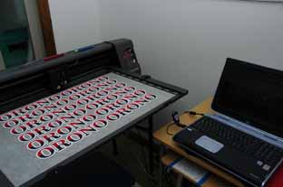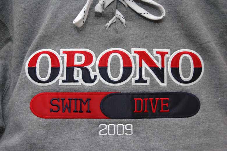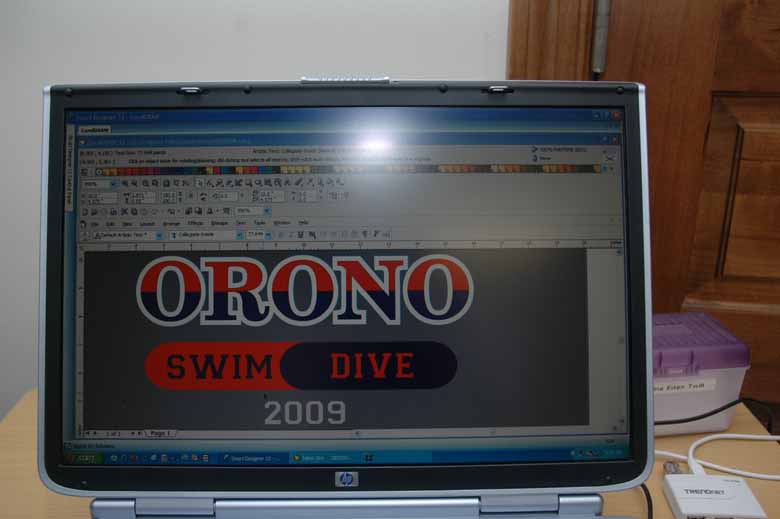 Shown below is part of the design process -- from creation on the laptop, to cutting of the twill on the plotter, to finished sweatshirt. The same design was screenprinted on t-shirts for the parents to cheer on their swimmers at meets.